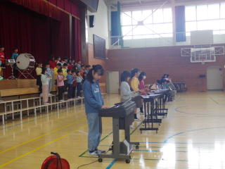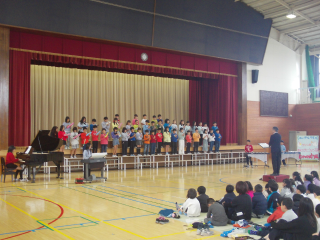 4年生の次は5年生。担任の先生のギターと鉄琴の演奏に合わせて,「ビリーブ」をきれいに合唱して,披露しました。