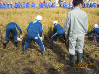 バスで多賀城政庁跡の近くの田んぼに移動しました。開会のセレモニーでご挨拶や古代米の歴史,宇宙米や田植えの仕方の説明を受けた後,いよいよ田植えがスタートしました。2つのグループに分かれ,始めに1組が田植えをして,2組が稲の補充役を行いました。後半は,2組が田植えをしました。